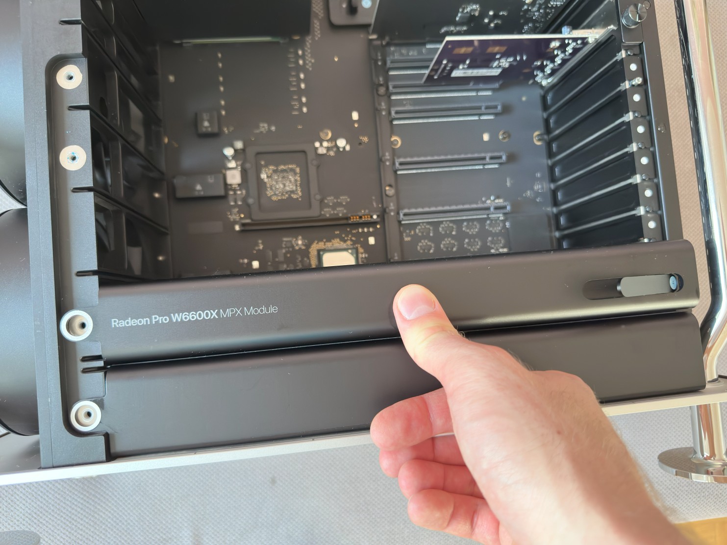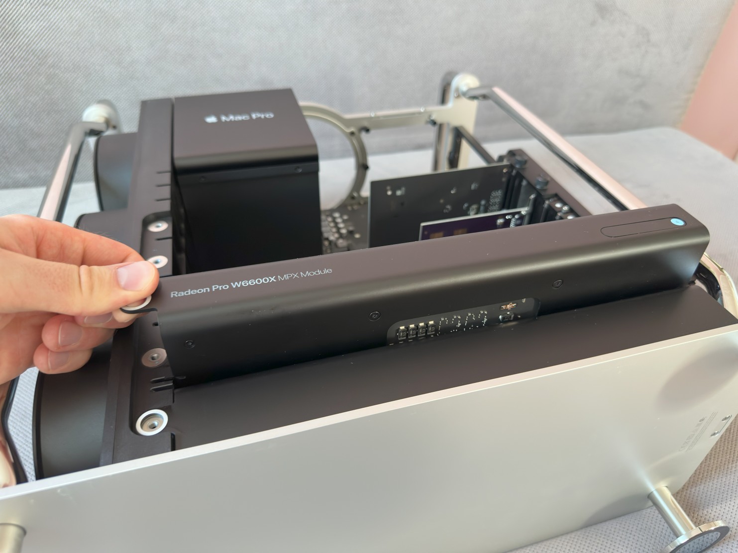 You can install up to two MPX modules inside slots 1-2 and slots 3-4 in a Mac Pro 7,1 (2019). Radeon Pro 580X and Radeon Pro W6600X can be installed as a single MPX module only.
