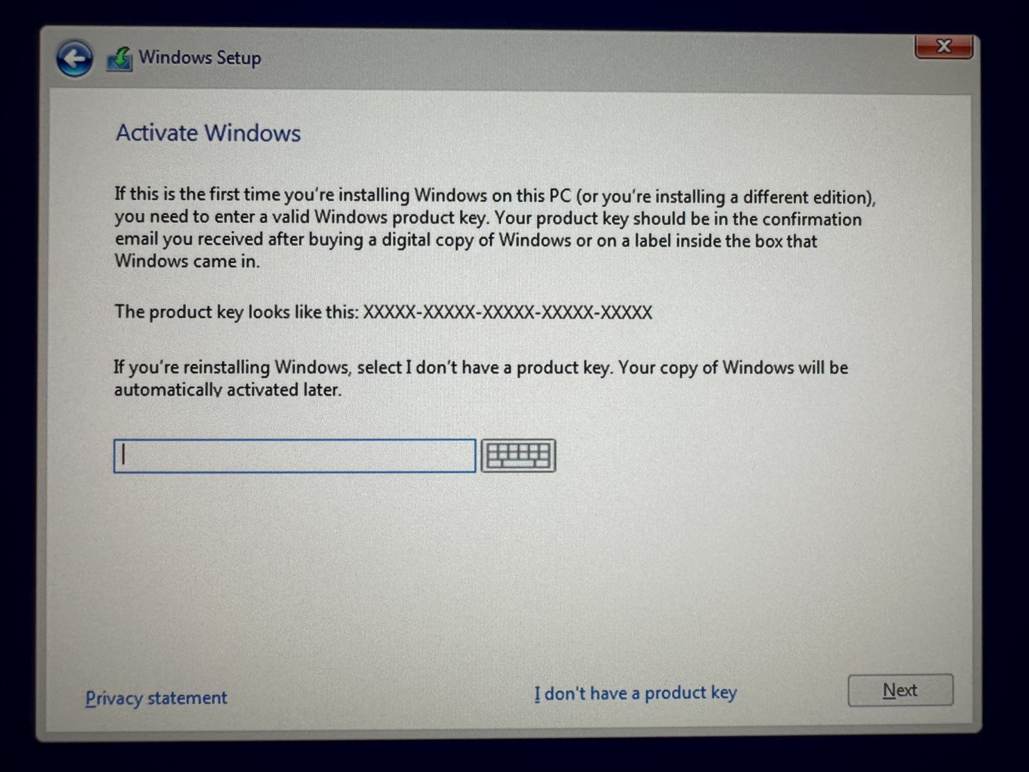 Step 13Enter your Windows 10 product key and click Next button. If you don't have it yet, simply click I don't have a product key. You will be able to enter your Windows 10 product key later and activate Windows. |