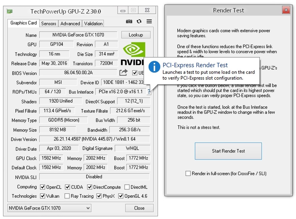 Click question mark symbol next to Bus Interface, then click Start Render Test button. |